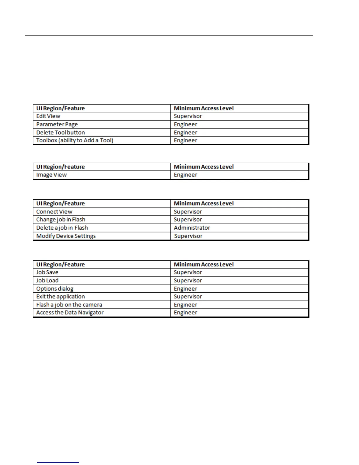 and for several features of the software. The following tables show the securable areas of