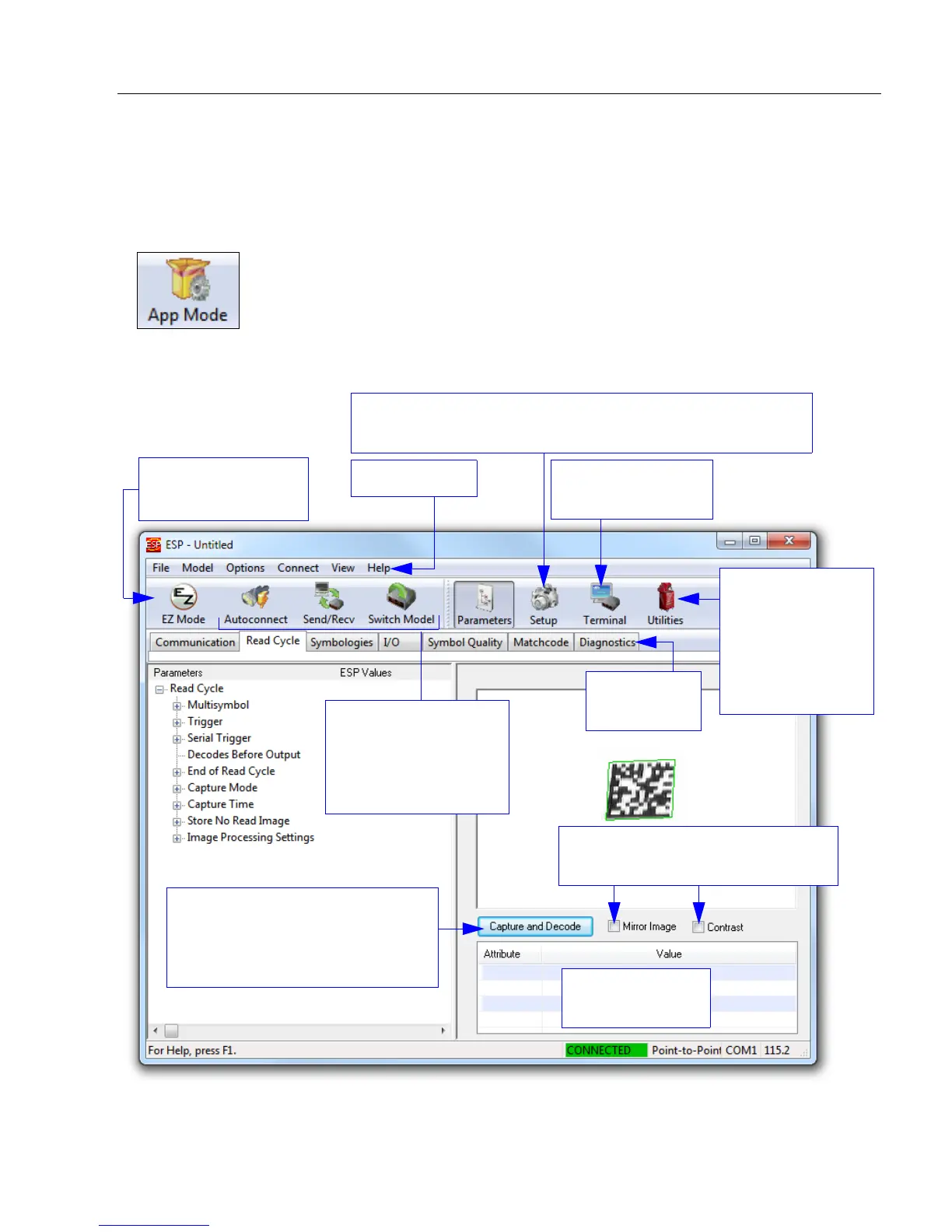 Note: The App Mode and EZ Mode buttons appear in the same position to allow easy
