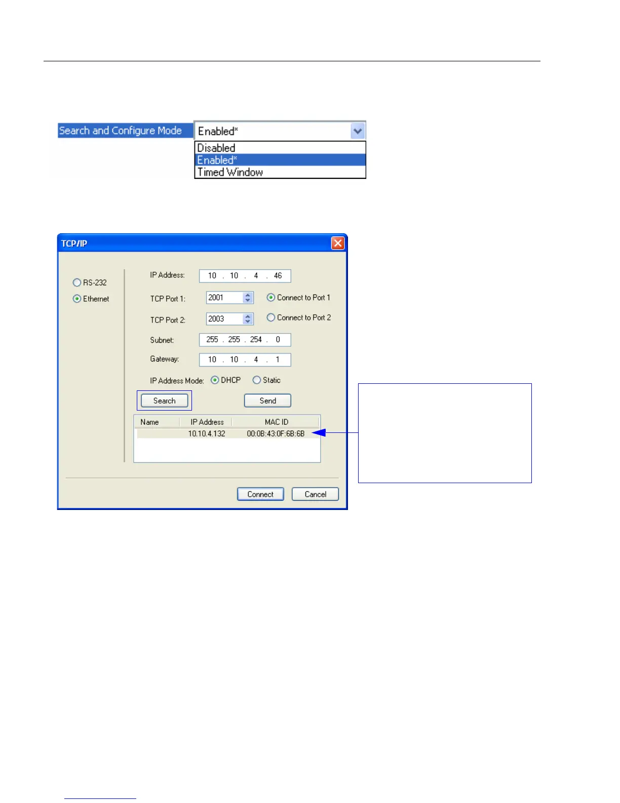 the Ethernet TCP/IP connect dialog section of the Connection Wizard: