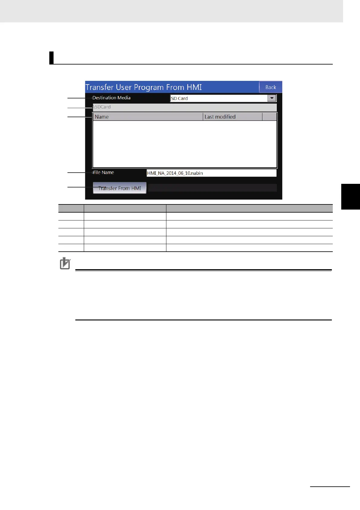 (e) Transfer from HMI Uploads the selected project from the HMI to the destination media.