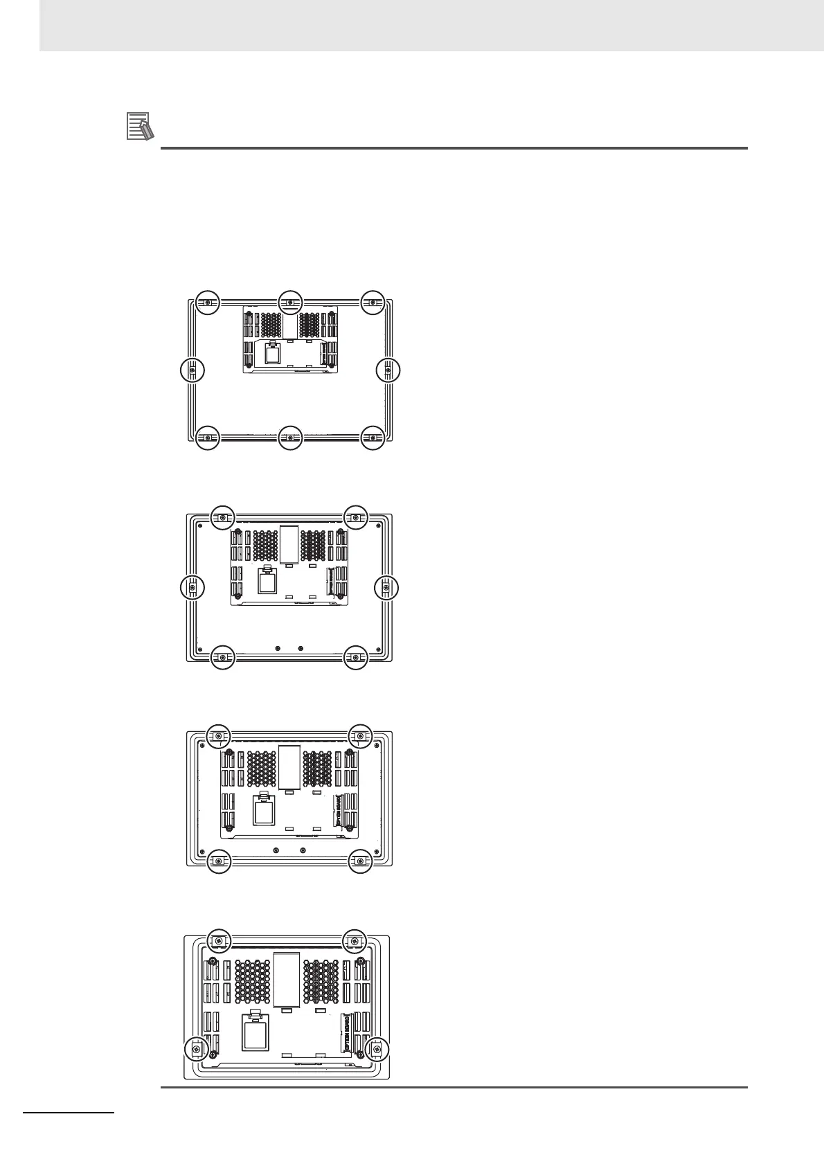 Secure the NA Unit with mounting brackets in the eight locations shown below.