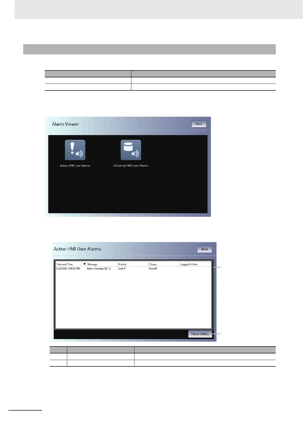 (a) Active HMI User Alarm List Displays a table of the current user alarms.