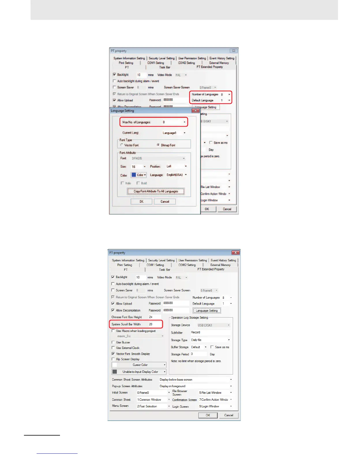 System Scroll Bar Width: Refers to the component with the scroll bar such as operation log