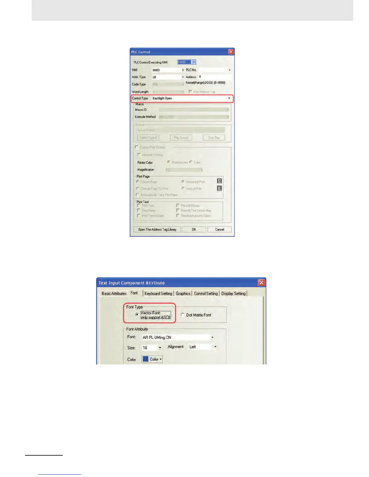 Component do not support vector font, but only support Dot Matrix Font, as shown below: