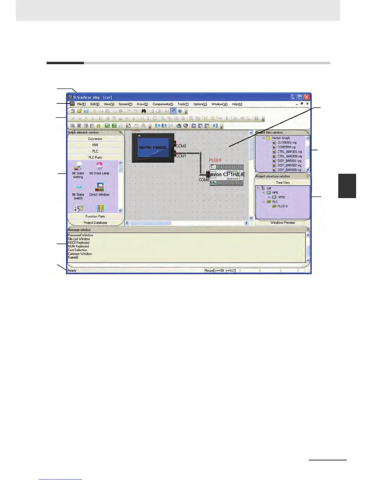 The Graph Element Window contains: Communication Connection, HMI, PLC, PLC Parts,