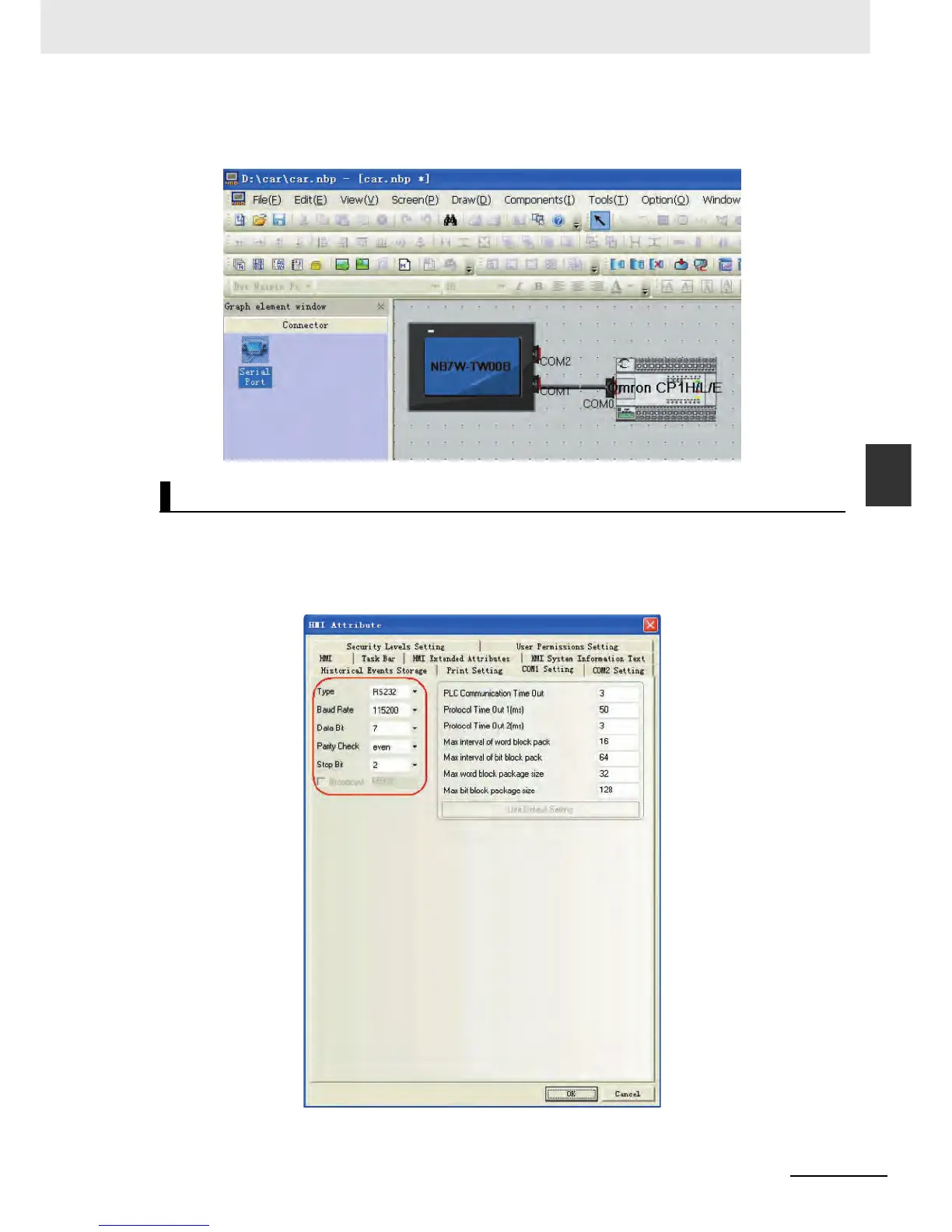 PLC appears. Then double-click the HMI and “HMI Attribute” window pops up, select “COM1