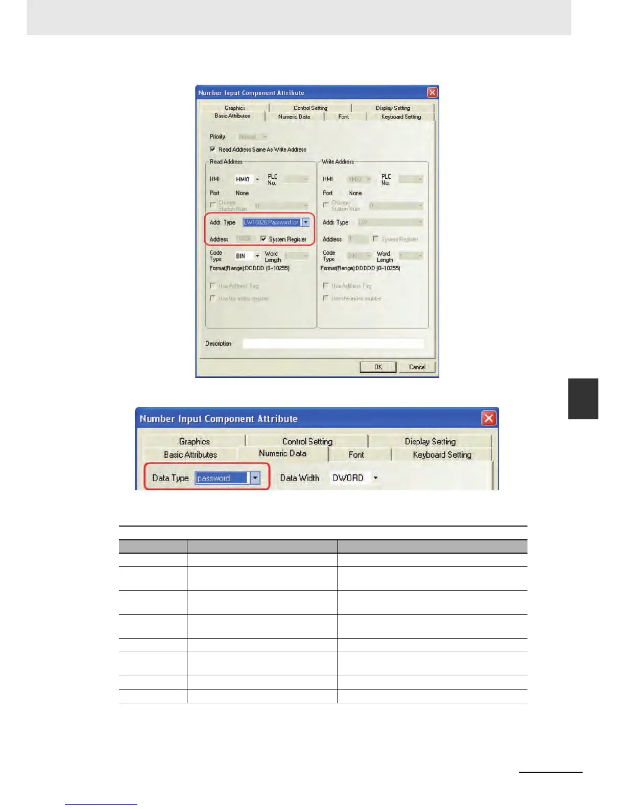 Select [Password] for the Data Type in the attributes page of [Numeric Data], as follows:
