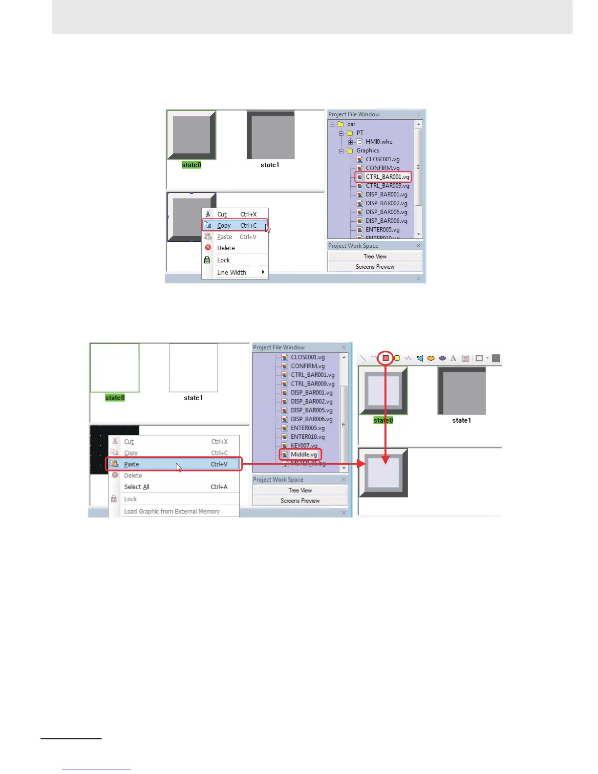 Then select “Middle.vg” graphics, and copy the graphics to be copied into it. Copy the “state1”