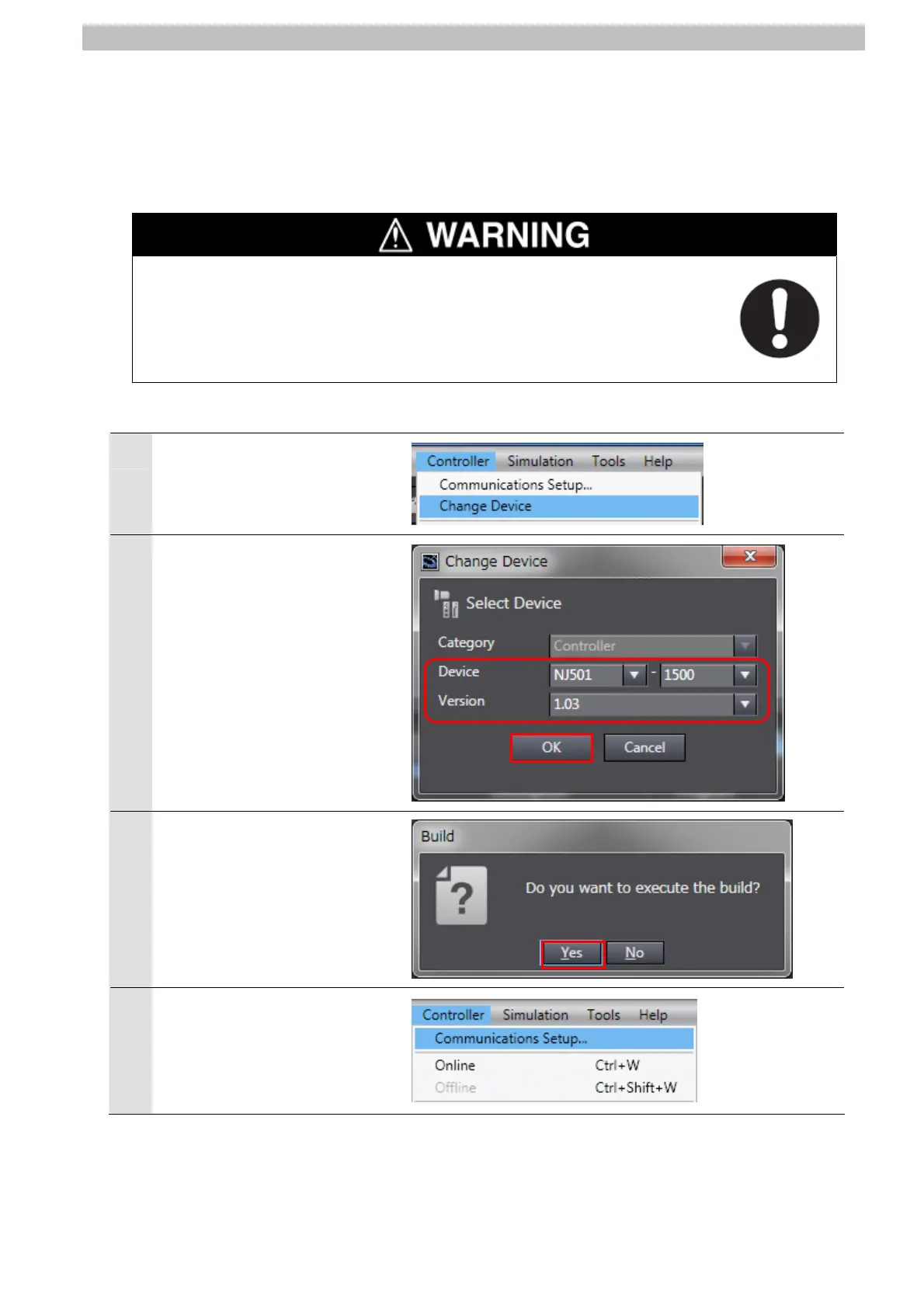 Connect online with the Sysmac Studio and transfer the project data to the Controller.