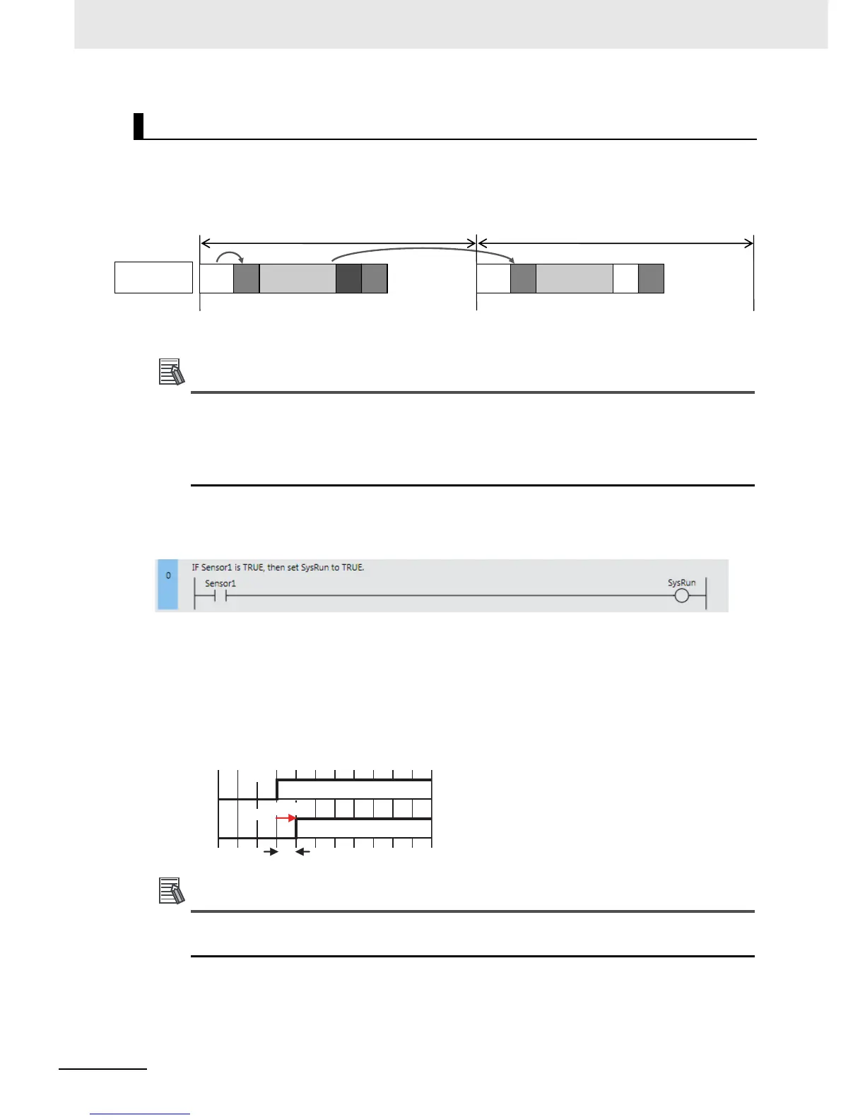 Therefore, in the data trace display, SysRun is shown as TRUE one task period after Sensor1.