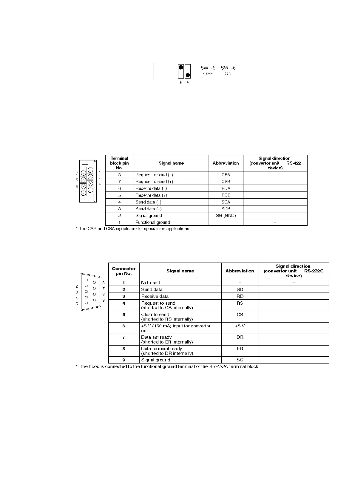 The pin arrangements for the RS-422A/485 terminal block and the RS-232C connector