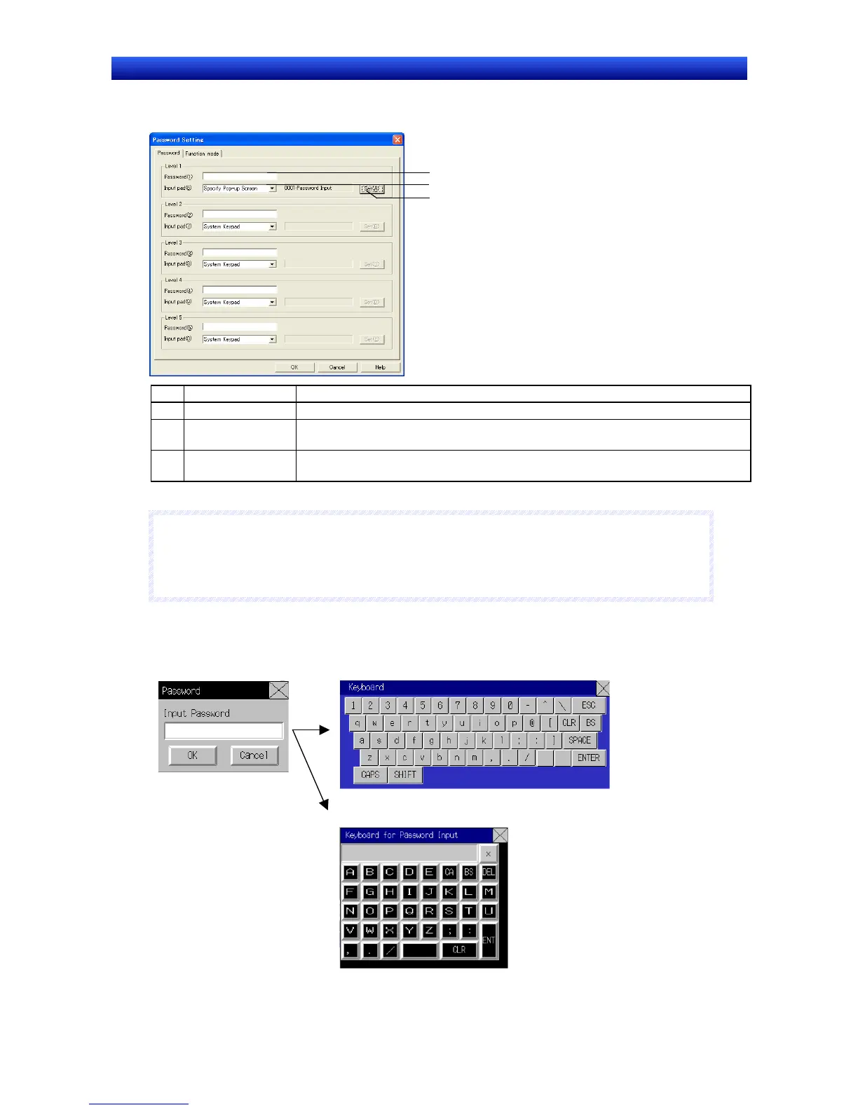 1 Password Set the password for each level (up to 16 alphanumeric characters).