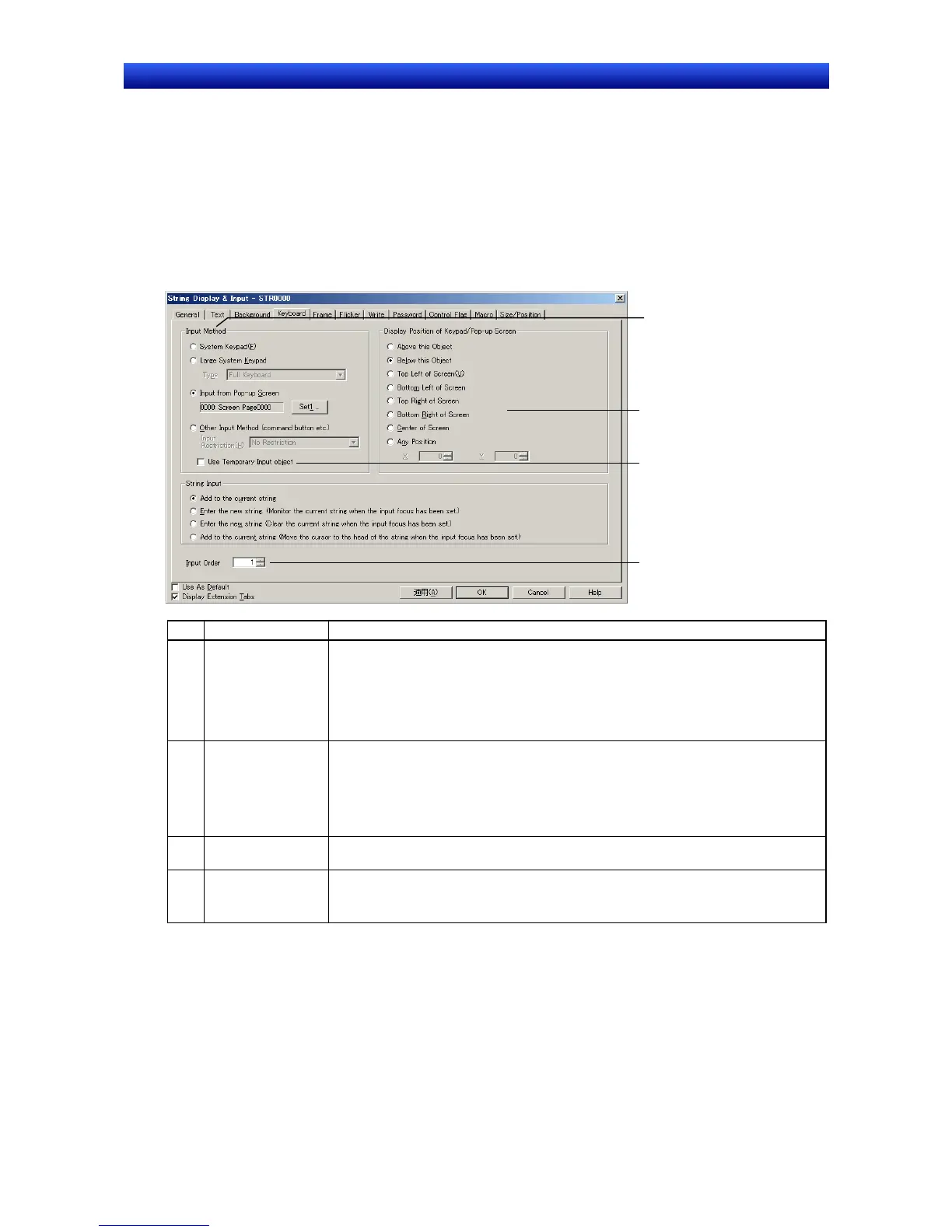 Set the order for moving the input focus. Refer to 2-8 Common Functional Object