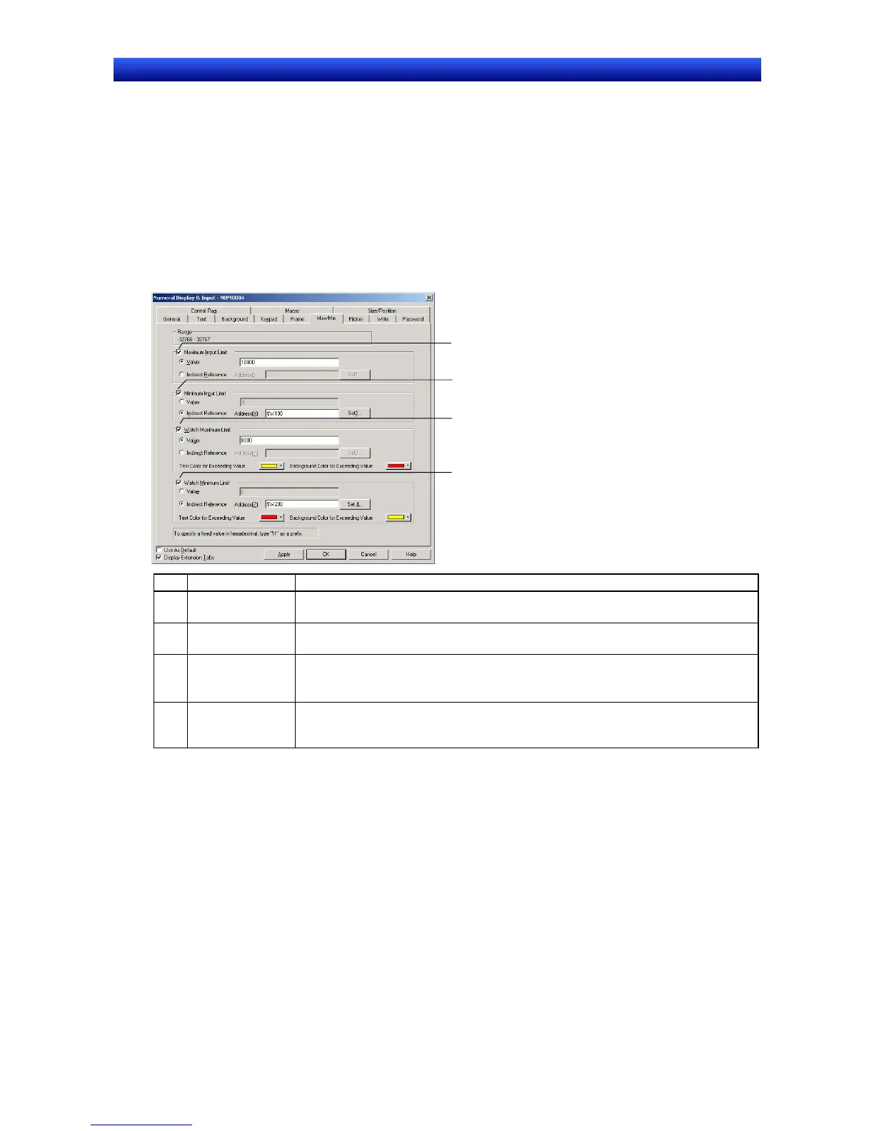 This tab page is also used to set the watch maximum and watch minimum limits for input values, as