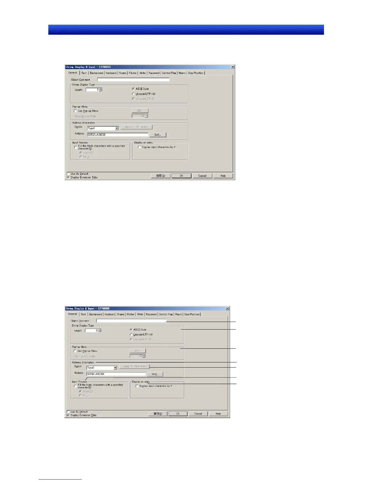 This section describes the settings items in the Functional Object Properties Dialog Box for string dis-