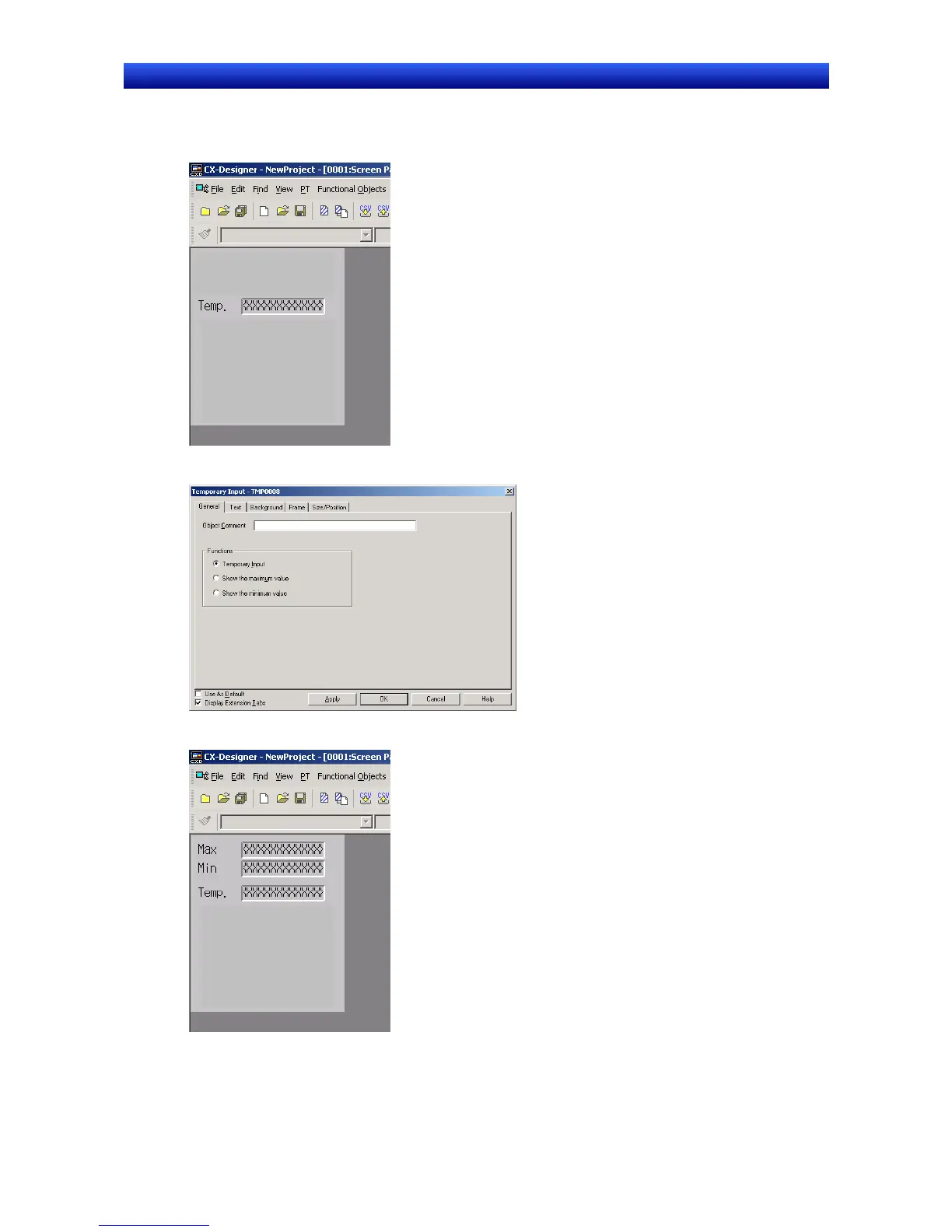 3. Position the temporary input objects on the screen for displaying the maximum and minimum