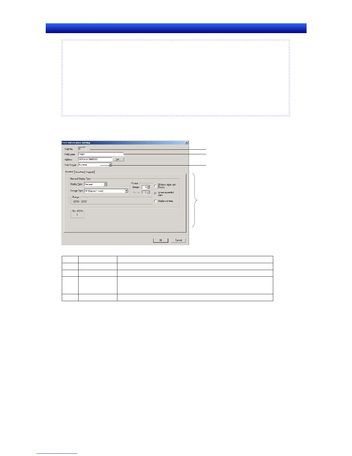 This section explains the properties in the Field Setting Dialog.