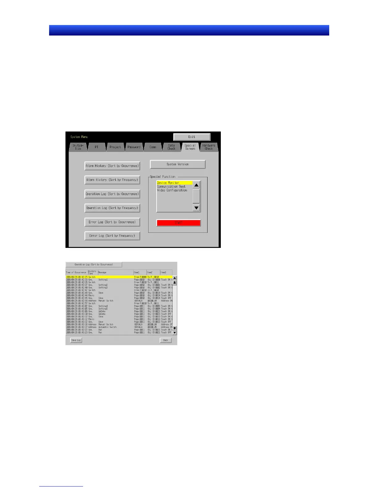 2. Select Switch Screen – Display System Menu – Operation Log (Sort by Occurr.) or Operation