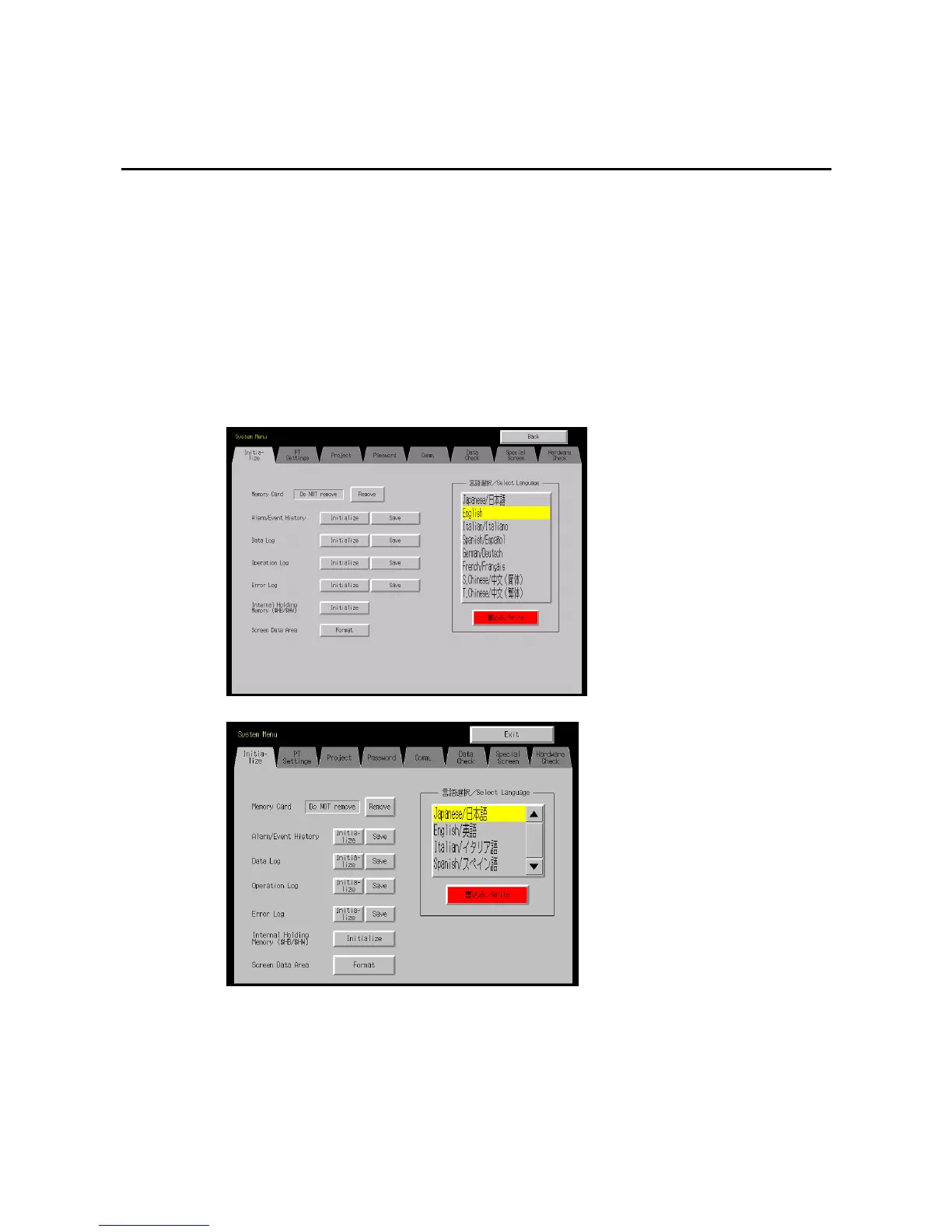 The Initialize Tab is used to initialize or save the PT data and specify the system language.