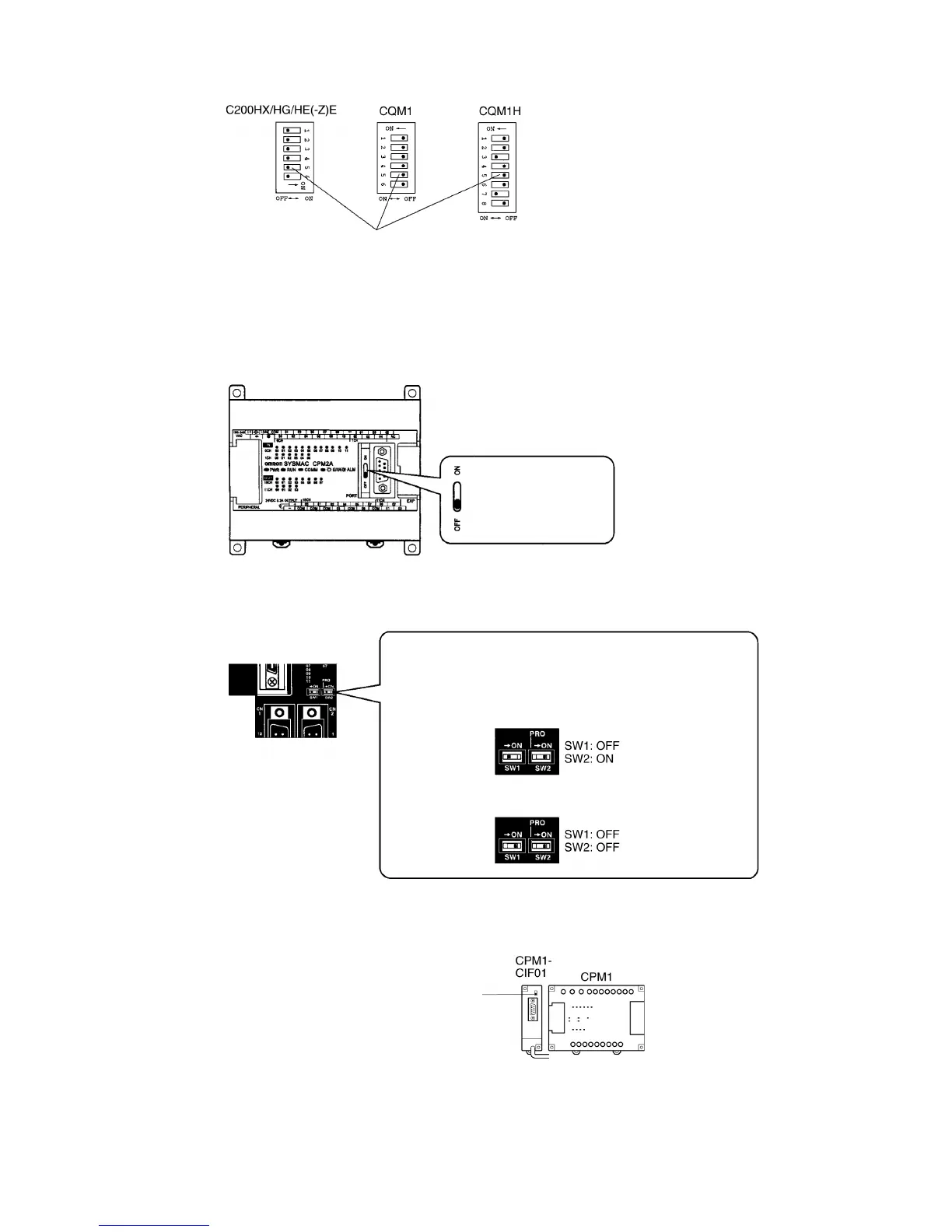When using a CPM2C, the switches on the front panel must be set as shown below in order