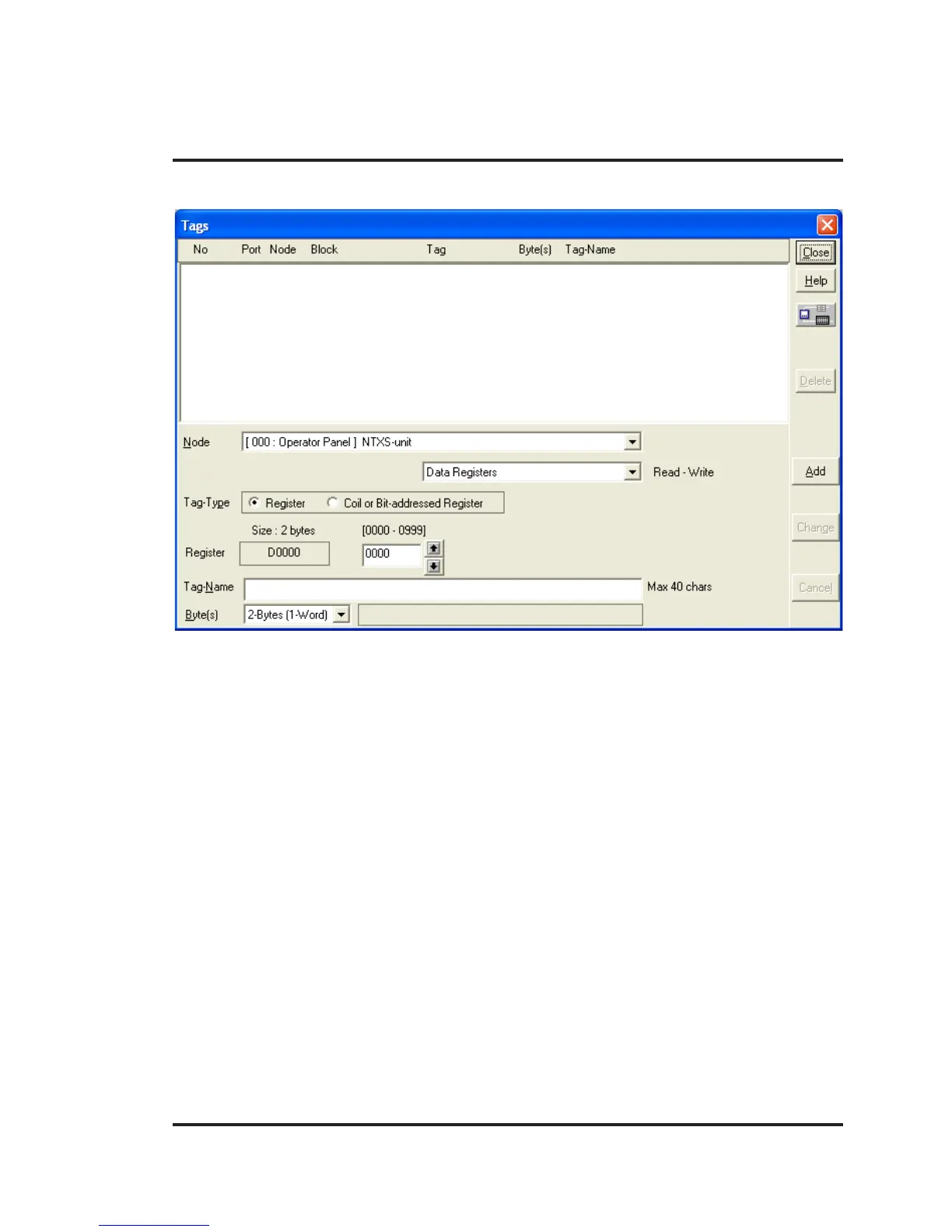 Change – User can change tag information (like register/coil number, tag name, Byte(s)) by selecting