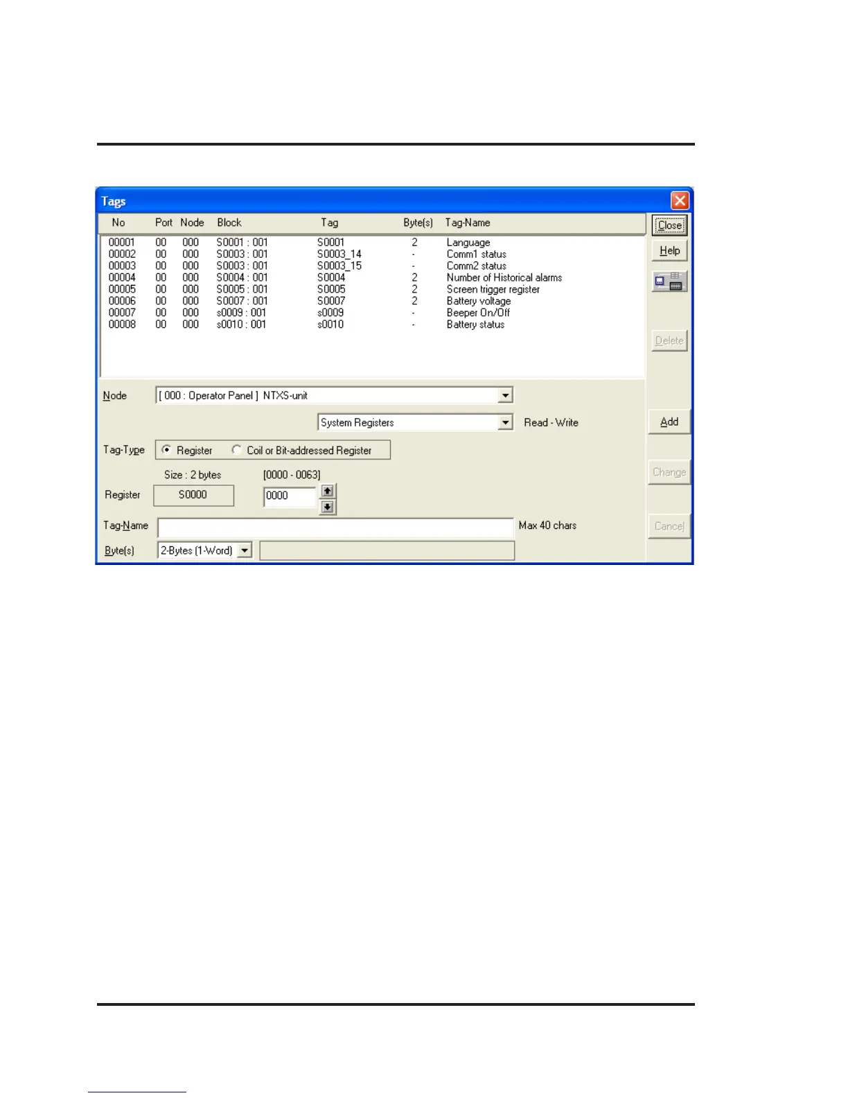 Change – User can change tag information (like register/coil number, tag name, Byte(s)) by selecting