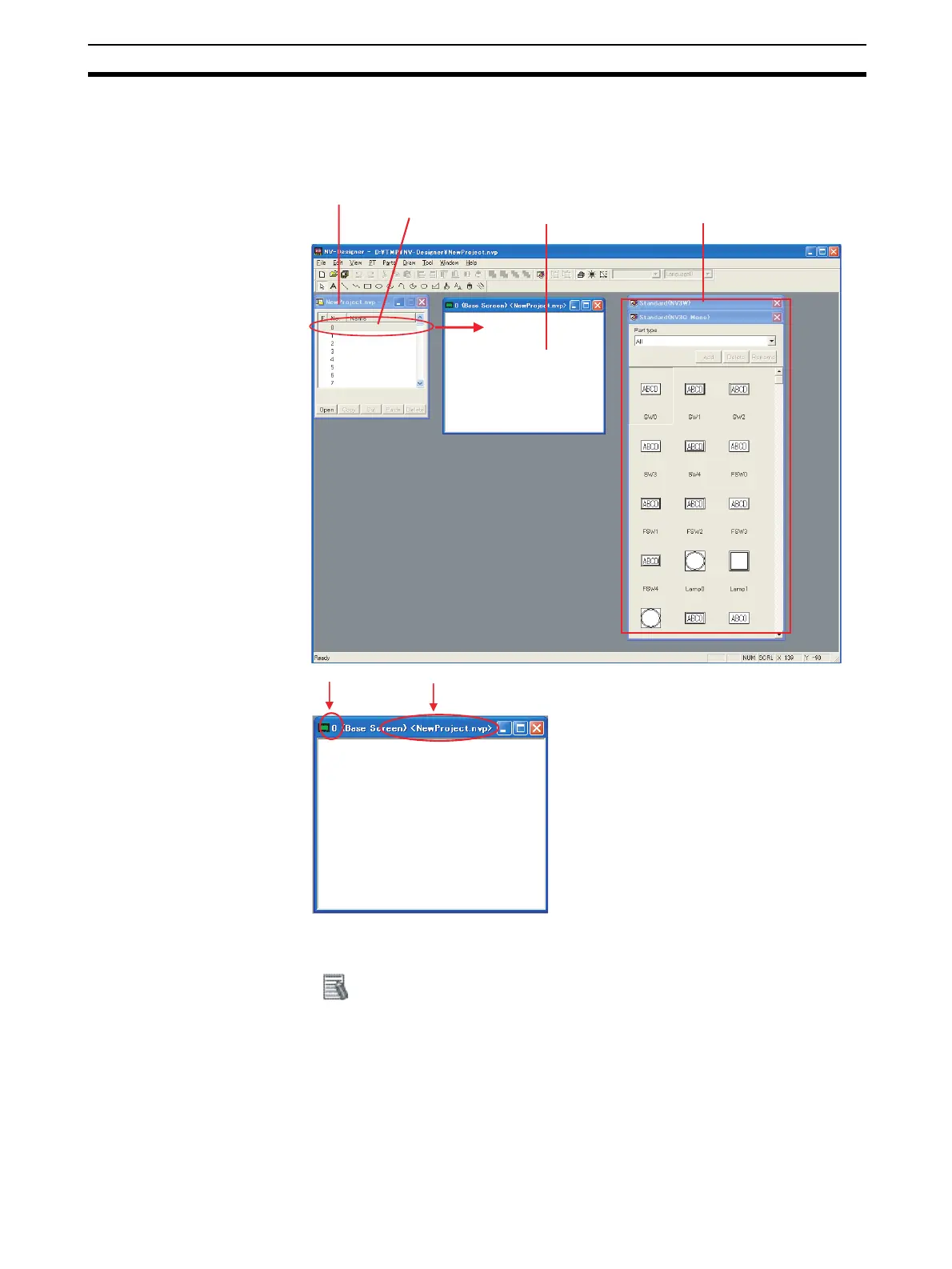 Click “0” in the Screen Manager. Base screen 0 and the Parts Library will be