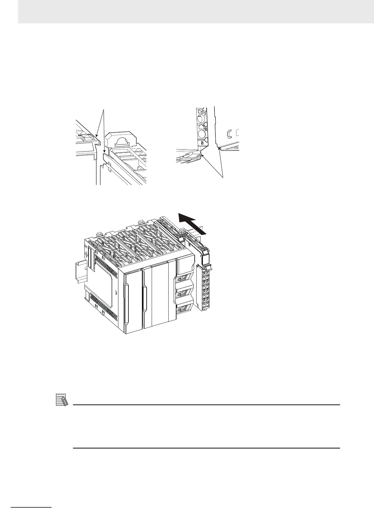 1 From the front of the CPU Unit, engage the Unit hookup guides on the NX Unit with the Unit
