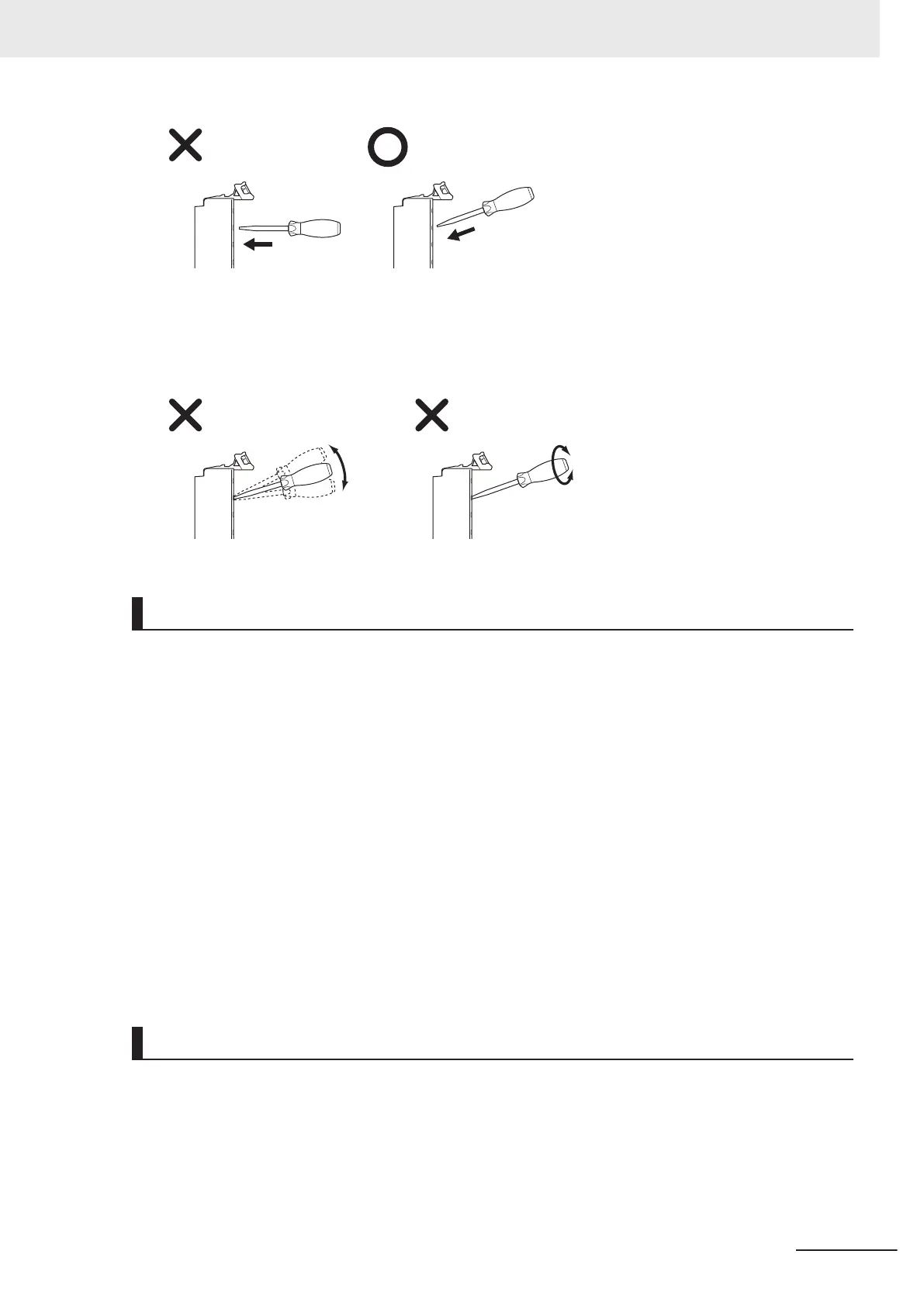 • When you insert a flat-blade screwdriver into a release hole on a screwless clamping terminal block,
