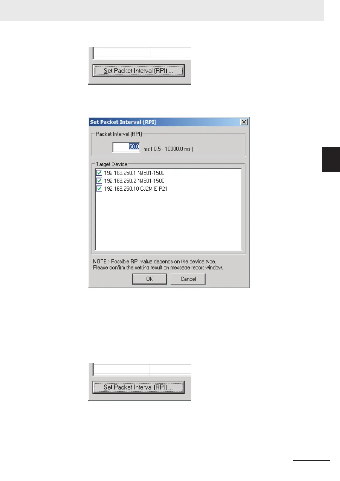 2) The Set Packet Interval (RPI) Dialog Box is displayed. In the Target Device Area, clear