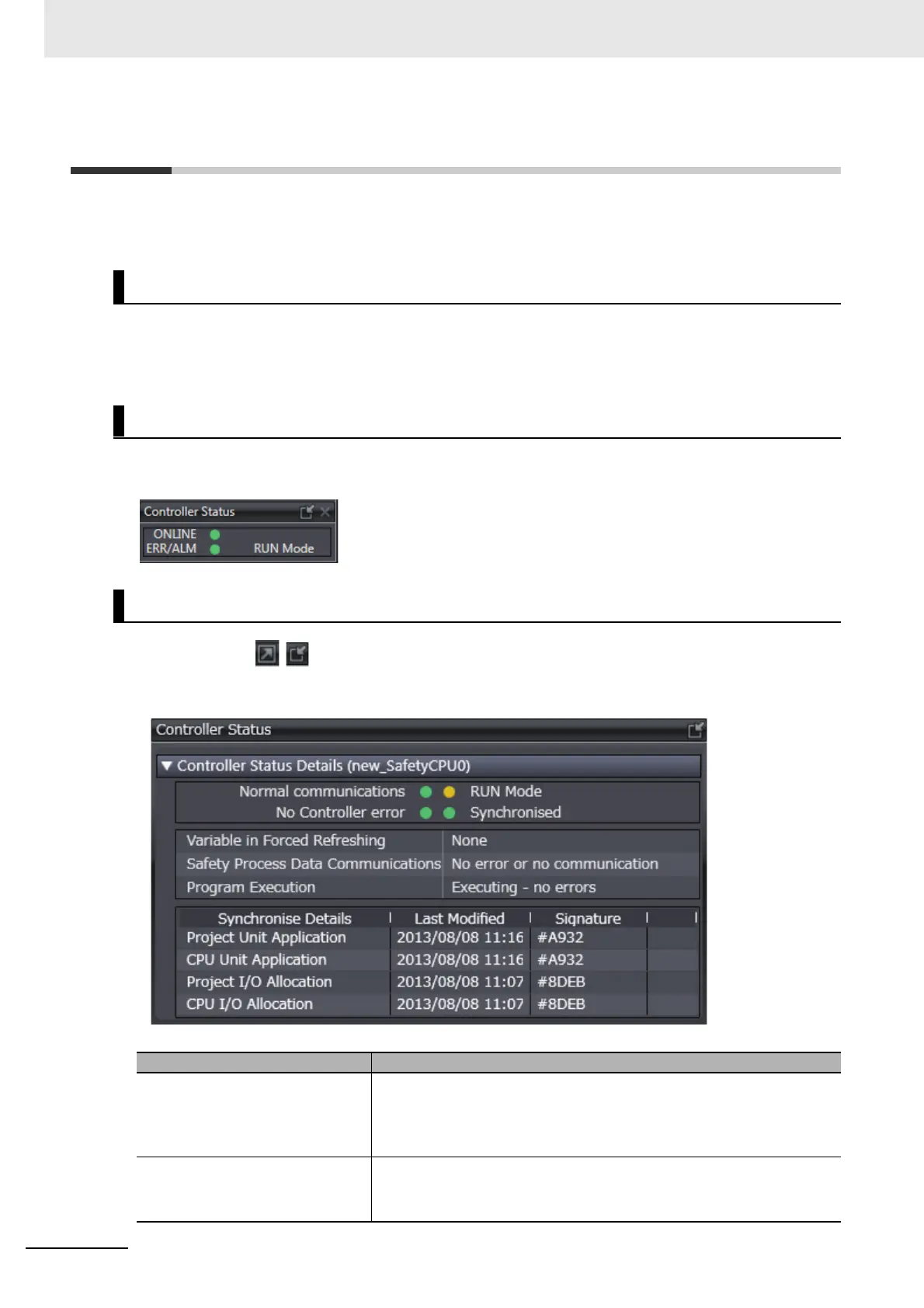 Control status monitoring is used to display the status of the connected Safety CPU Unit or Simulator in