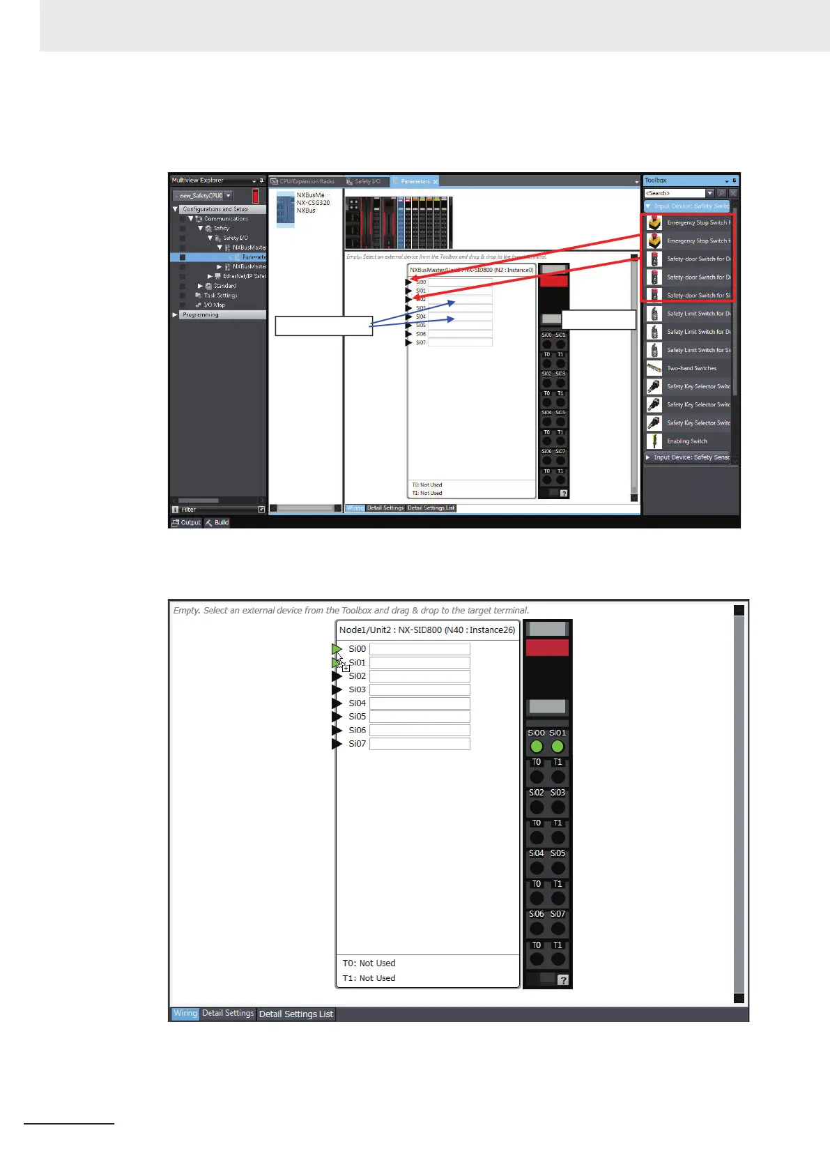 3 Select a device from the Toolbox to connect to the safety input terminal or safety output termi-