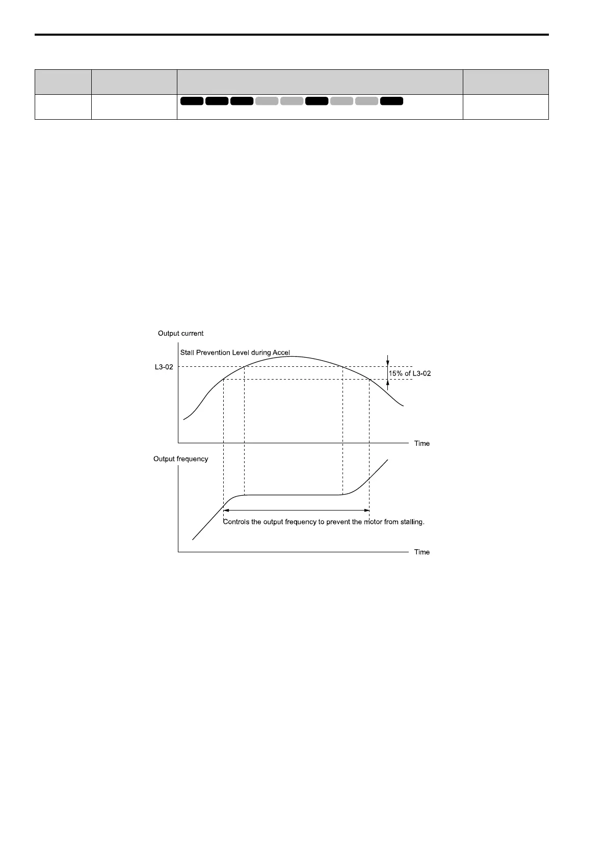 When the output current is less than the value set in L3-02 - 15%, the drive starts to accelerate again. The Stall