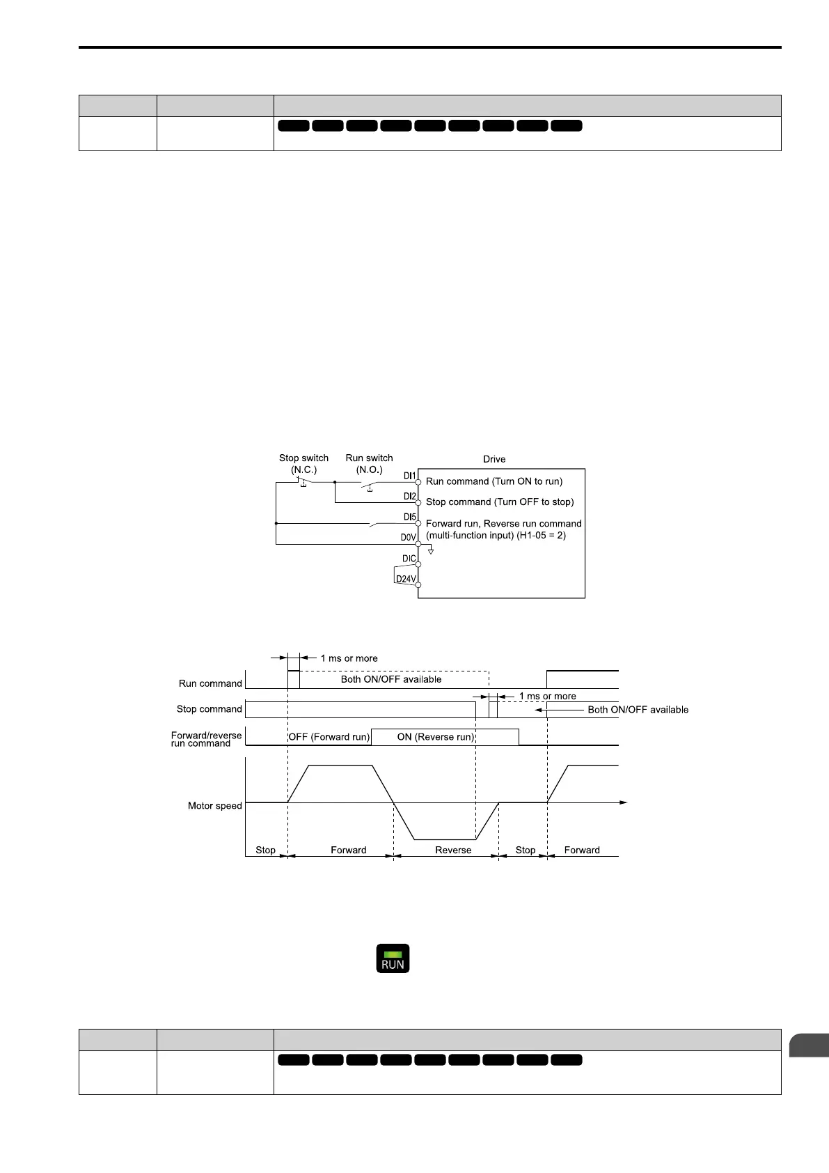 (STOP). When terminal DI1 (Run command) activates for 1 ms minimum, the drive rotates the motor. When
