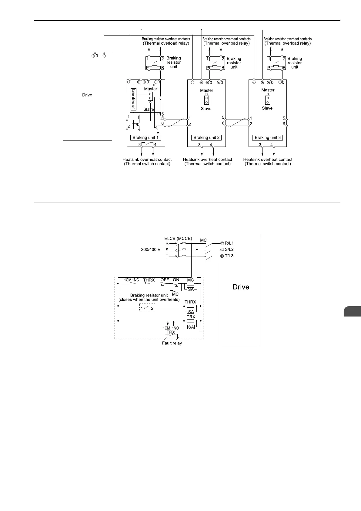 WARNING! Fire Hazard. When you use a braking unit, use a thermal relay on the braking resistors and set a fault contact
