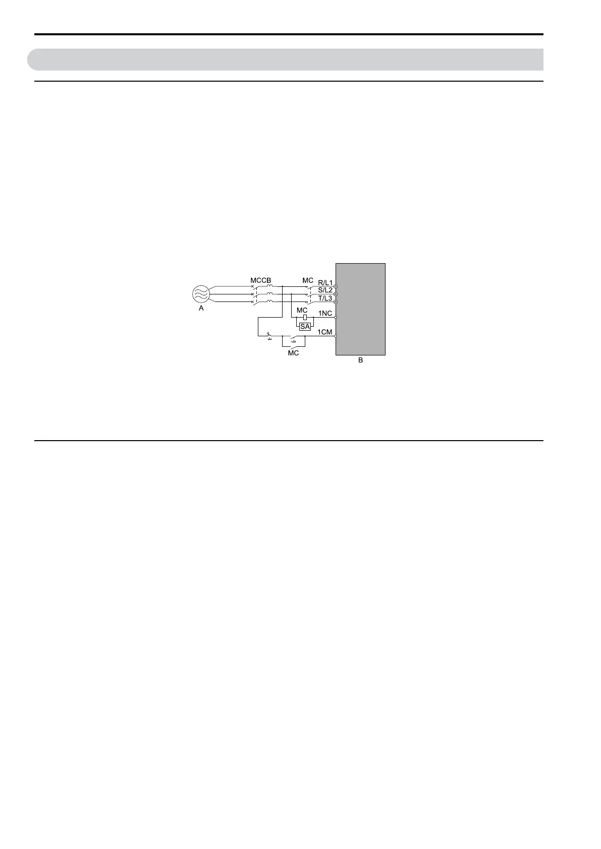 between the power supply and main circuit power supply input terminals R/L1, S/L2, and T/L3. The MCCB/