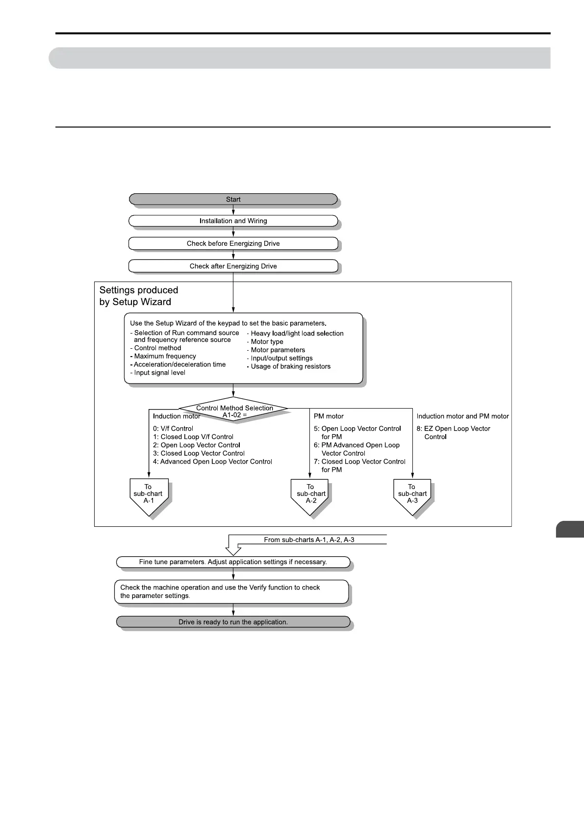 Flowchart A shows a basic start-up sequence to connect and run a motor with a minimum of setting changes.