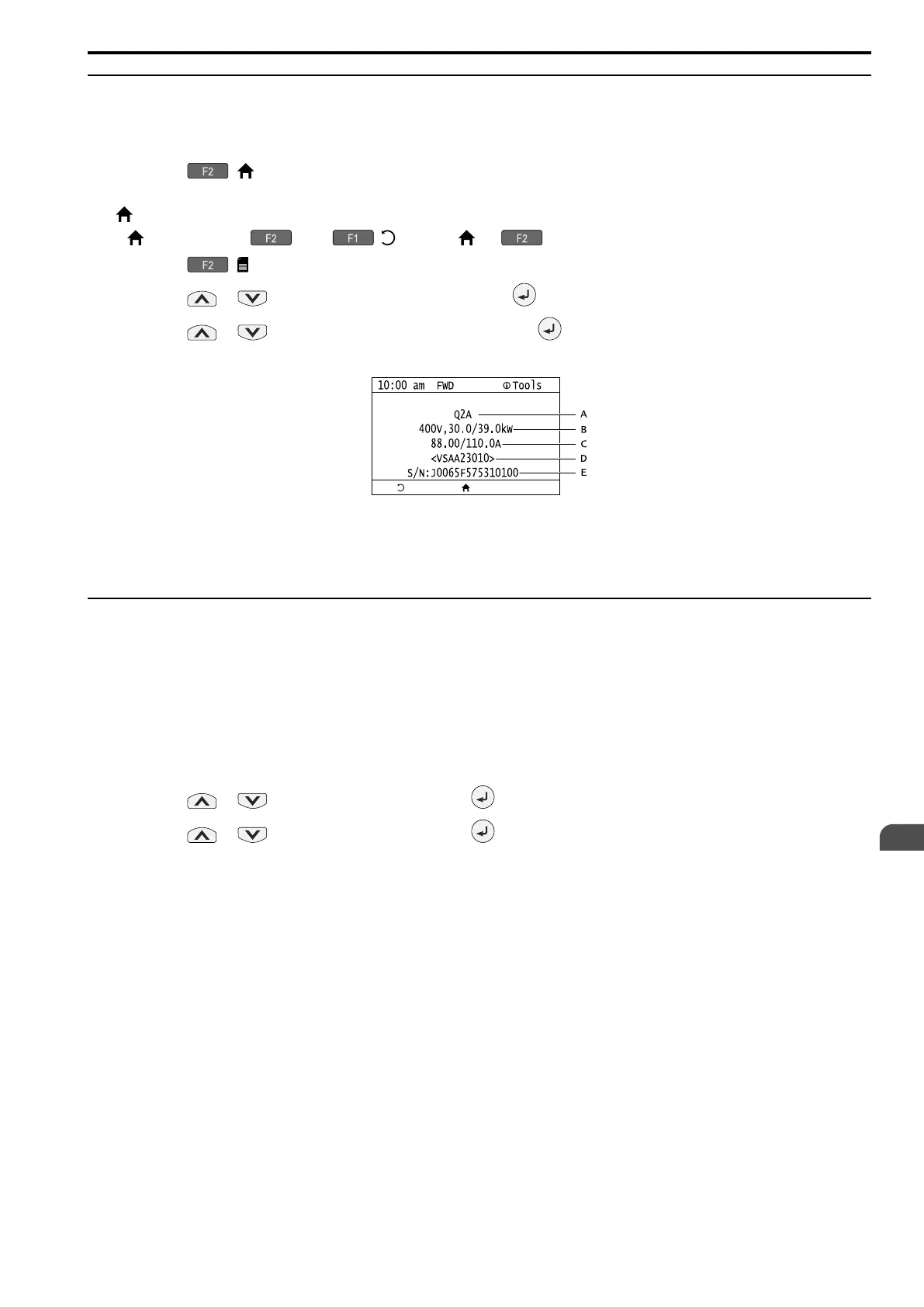 rated output current (HD/ND), software version, and the serial number on the keypad.