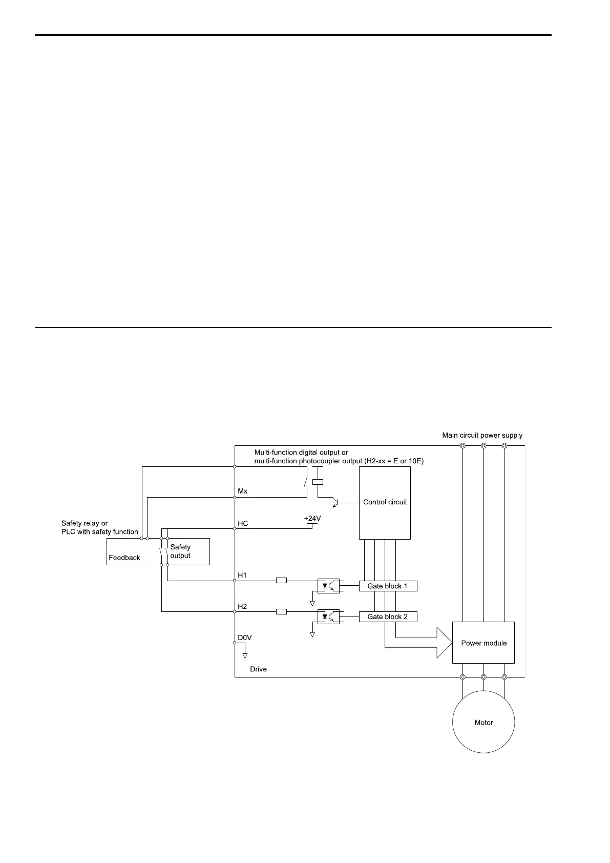 NOTICE: A maximum of 3 ms will elapse from when terminals H1 or H2 shut off until the drive switches to the "Safe Torque Off"