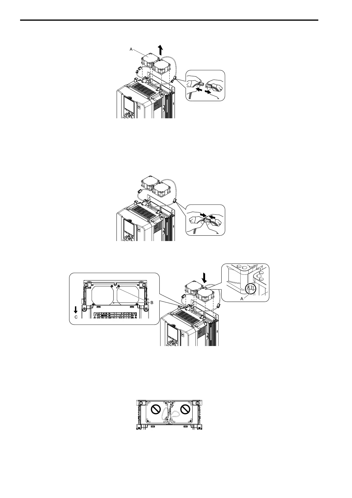 When you install the cooling fan, make sure that you do not pinch cables between the cooling fan and the drive.