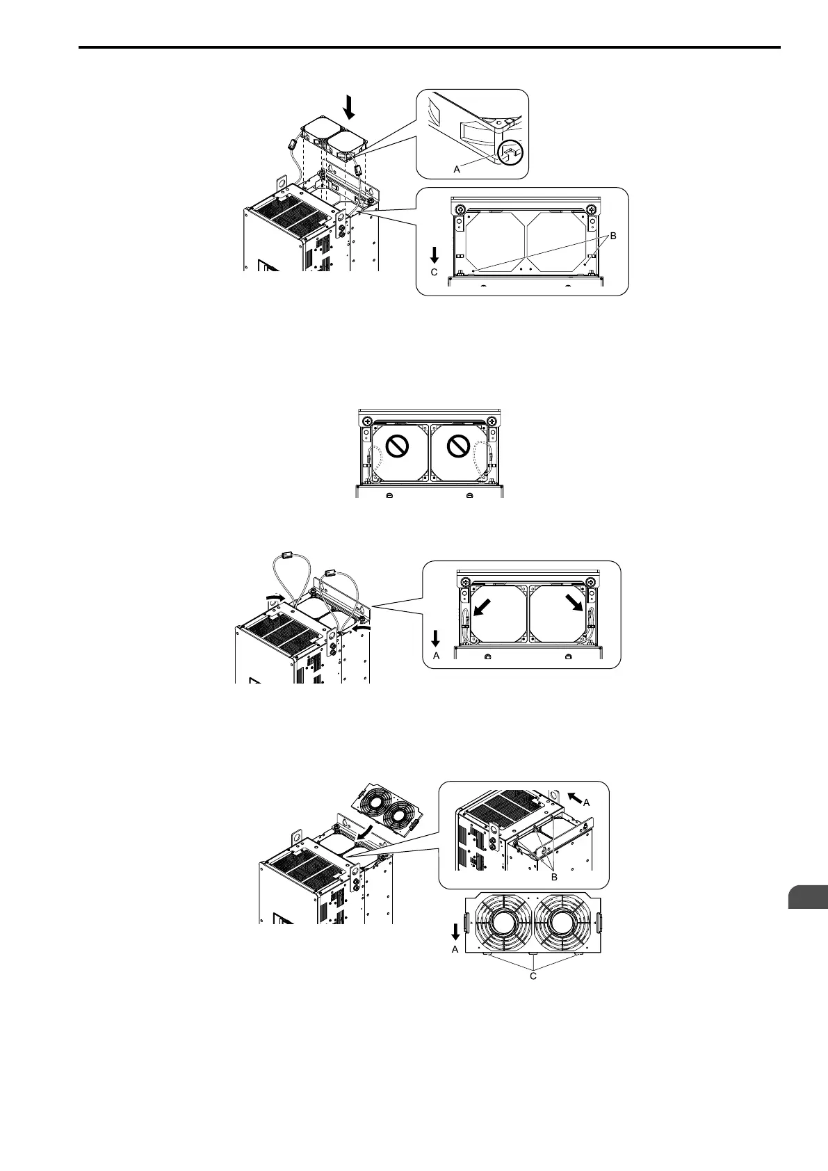 When you install the cooling fan, make sure that you do not pinch cables between the cooling fan and the drive.