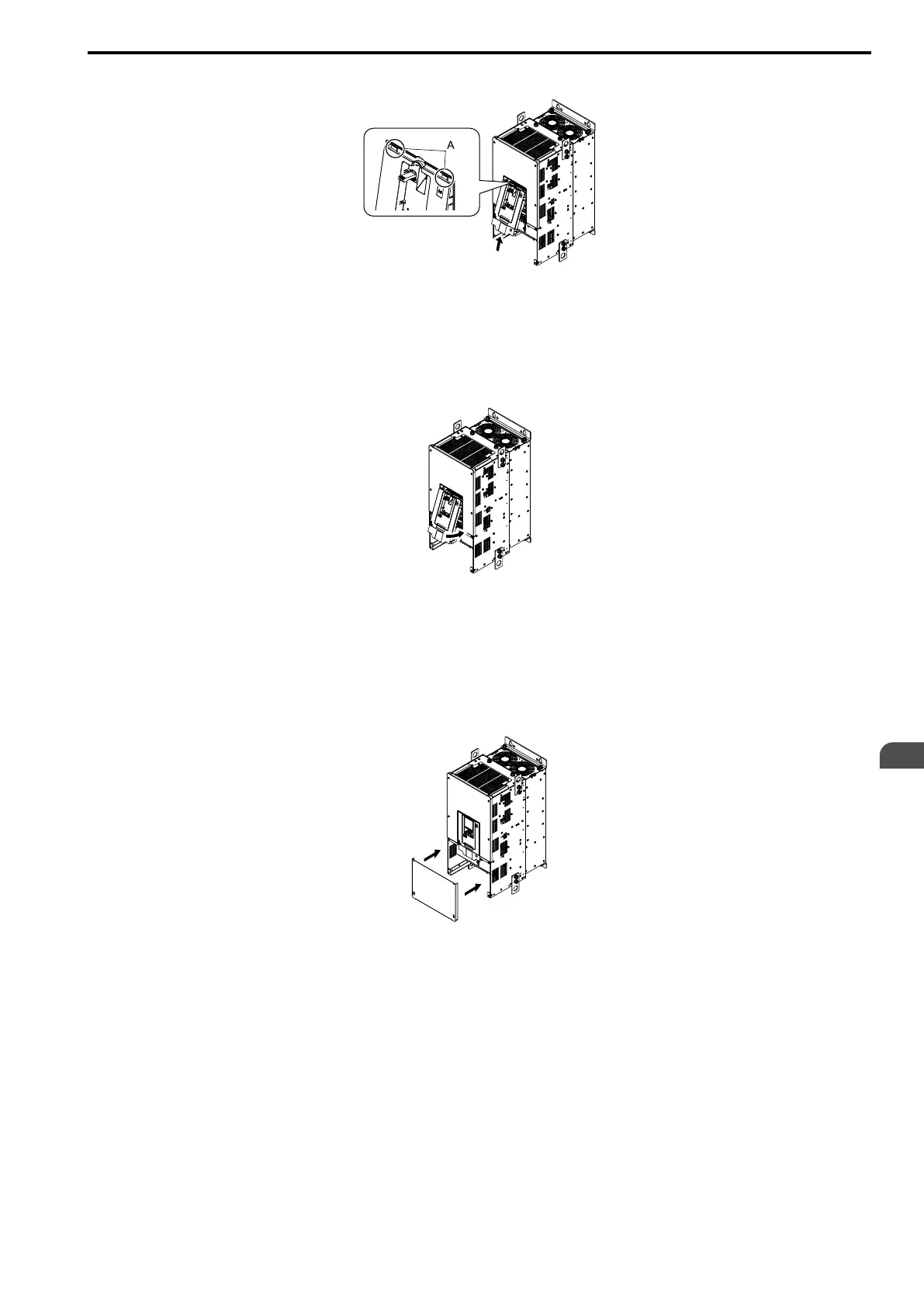 • Make sure that you do not pinch wires or signal lines between the wiring cover and the drive before you reattach the cover.