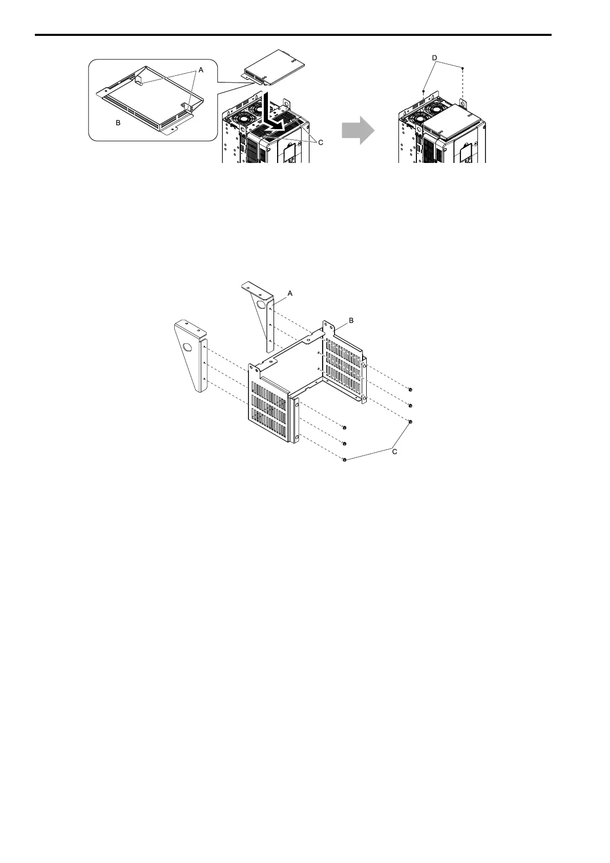 2. Align the screw holes on conduit bracket 1 with the screw holes on the drive and push the bracket into