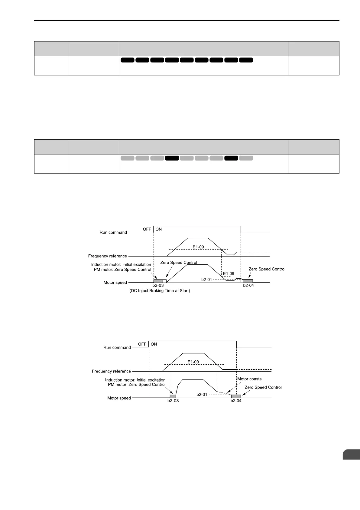 coasts to stop. If the motor speed is less than or equal to the value set in b2-01, then the drive will do Zero Speed