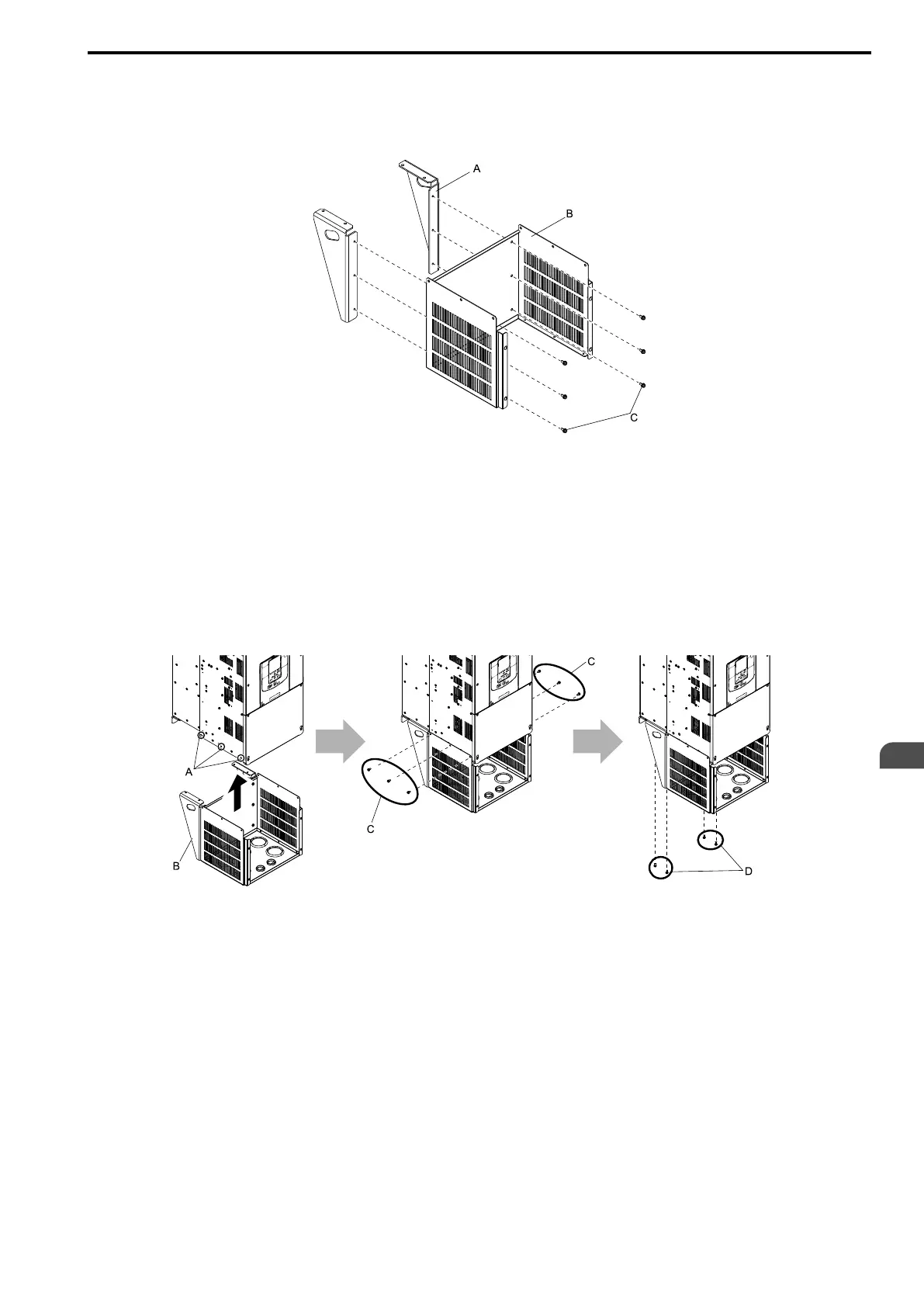 2. Align the screw holes on conduit bracket 1 with the screw holes on the drive and push the bracket into