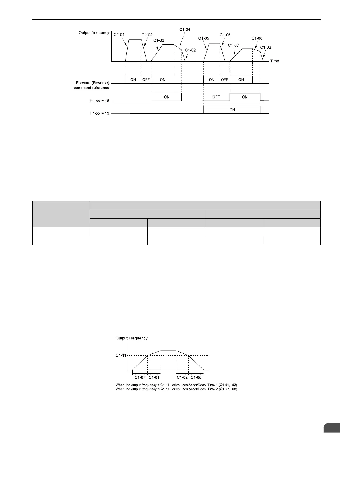 C1-11 [Ac/Dec Switch Frequency], the drive automatically switches the acceleration and deceleration times. Set