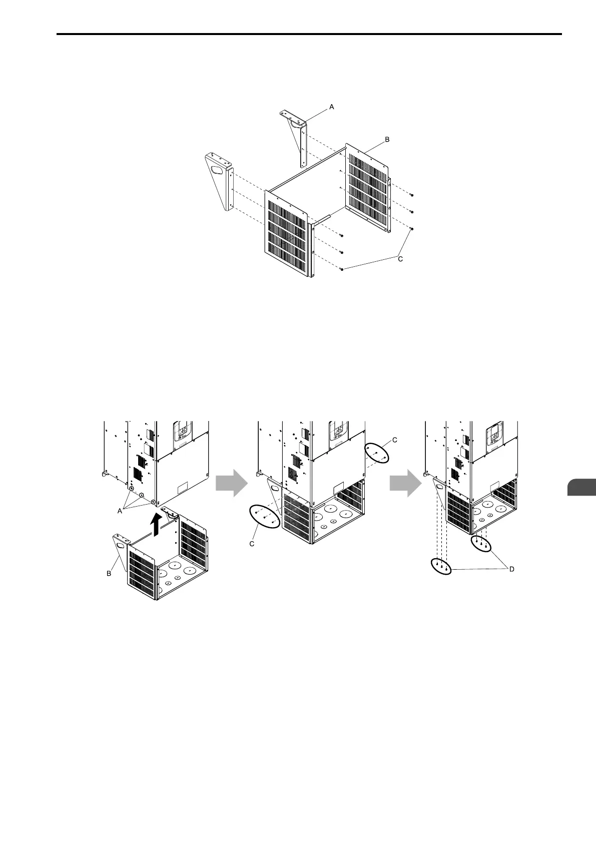 2. Align the screw holes on conduit bracket 1 with the screw holes on the drive and push the bracket into