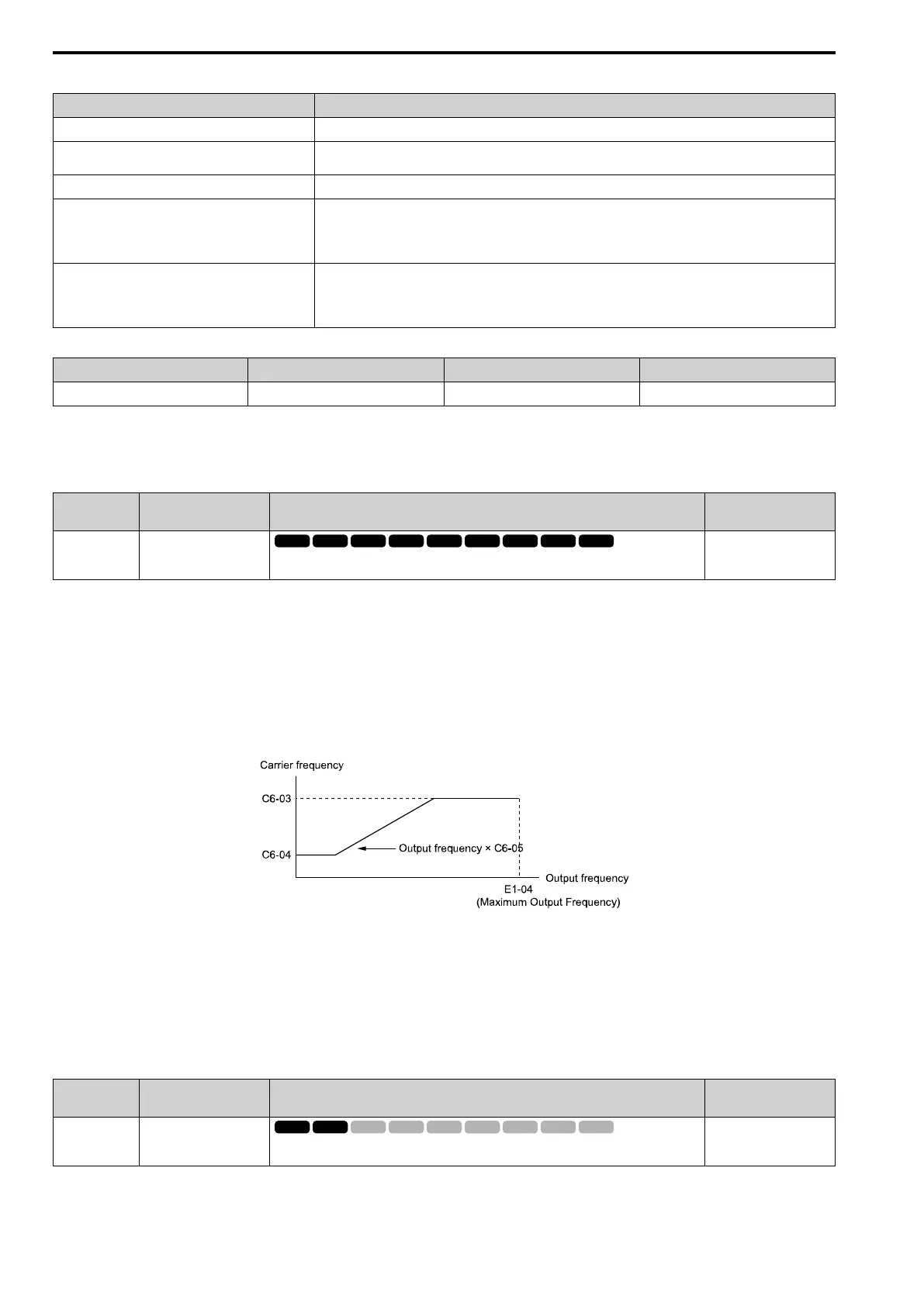 • When C6-05 ≤ 7, the drive disables C6-04. The carrier frequency is fixed to the value set to C6-03.