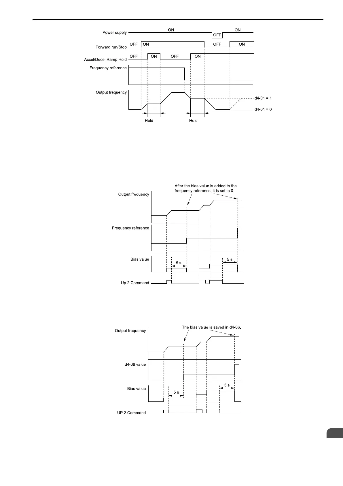 Set the Up/Down 2 upper limit [d4-08] and lower limit [d4-09] correctly to use the frequency reference hold function and the Up/Down