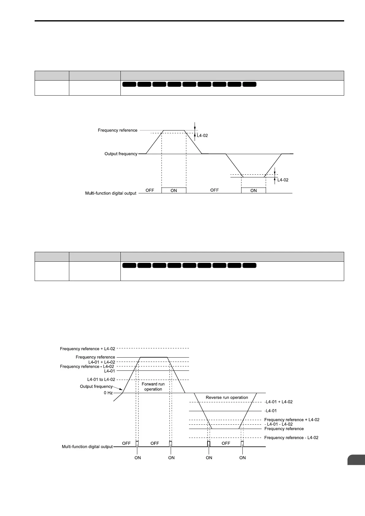 OFF : The output frequency is not in the range of L4-01 ± L4-02 or the in the range of frequency